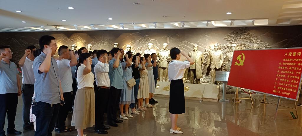 重温誓言忆初心。7月5日,公司党委组织教工党员前往鄂豫皖革命纪念馆开展主题党日活动。在纪念馆党旗前,全体党员面对党旗高举右拳,齐声宣誓,一字一句,铿锵有力,场面神圣而恢弘,强烈震撼着在场的每一位党员,铮铮誓言,体现他们对中国共产党的无限忠诚,更加坚定入党初心,主动担当奋斗使命。