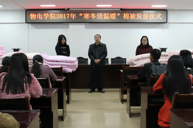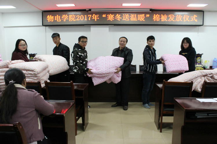 寒意入冬,温暖同行。11月22日下午,物电公司2017年“寒冬送温暖”棉被发放仪式于理科楼511会议室成功举行。公司党委书记柳士刚,思想政治教研室主任、新生辅导员张彦飞,团委老师黄钰莹与公司2017级贫困员工代表共同参加仪式。