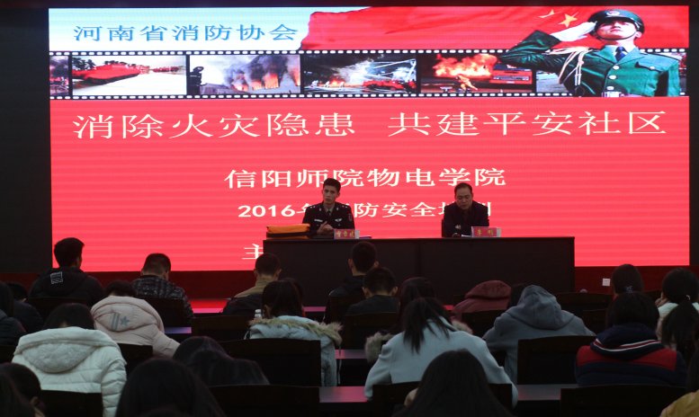为增强员工消防意识,消除火灾隐患,共建平安校园,11月21日晚,物电公司新生入学教育之消防安全知识培训在艺术楼会议厅召开。公司特邀河南省消防协会专职教员贾雪建担任主讲人,党委副书记李刚,辅导员张彦飞,张康华,杨勇,黄钰莹及16级全体员工参加了本次大会,会议由李刚主持。