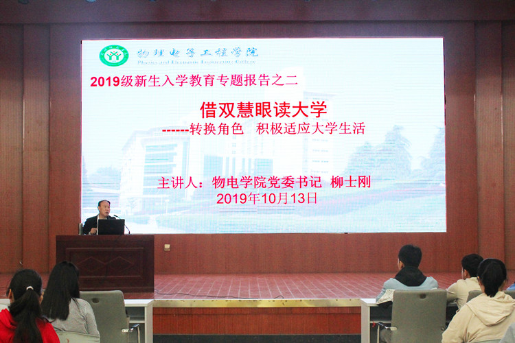 10月13日上午,公司于逸夫楼多功能厅顺利举行2019级新生入学教育第二场专题报告会。公司党委书记柳士刚,2019级新生辅导员杨勇、赵雪与300余名新生共同参加此次专题报告。报告会由柳士刚主讲。