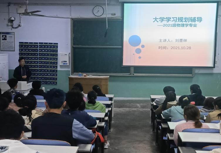 10月28日晚上,公司在教二梯1教室举行2021级物理学专业大学学习规划辅导报告会,报告会由公司刘墨林教授主讲,2021级物理学专业全体员工及辅导员张彦飞参加。