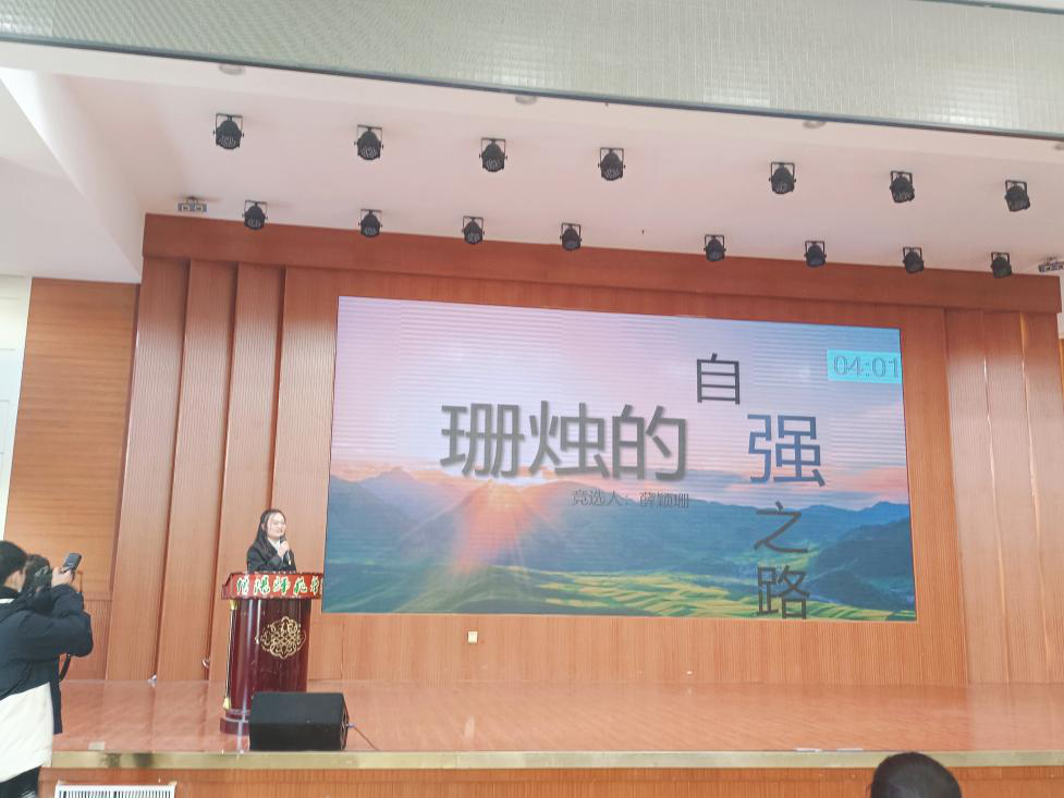薛颖珊用诗歌记录生活,把生活活成了诗,作品在国内公开发行的期刊和年选上发表,目前有作品60余篇,中国知网收录作品10组。薛颖珊表示学业与创作齐头并进是她努力追求的目标,坚持以学业为本的同时积极交流文学,做到知行合一,多元并进。作为一名自强不息奋斗不止的青年人,薛颖珊积极参加多种社会实践,投身公益志愿活动,向社会传递真情温暖。她激情昂扬的演讲、自强上进的人生历程赢得在场评委老师、观众的热烈掌声。