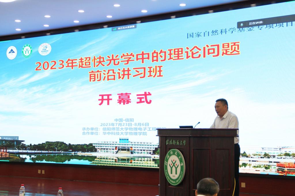 7月24日,由tyc33455cc太阳集团承办、华中科技大学物理公司协办的“2023年超快光学中的理论问题前沿讲习班”隆重开班。来自北京大学、中国科学技术大学、华中科技大学、中山大学、国防科技大学、中南大学、吉林大学、哈尔滨工业大学、兰州大学、华东师范大学、中国工程物理研究院研究生院、中国科公司物理研究所、中国科公司西安光学精密机械研究所等数十所高校和科研院所的100余位专家学者和博士、硕士研究生参加本次讲习班。tyc33455cc太阳集团副董事长井强山教授出席开班仪式并致欢迎辞。讲习班开班仪式由公司科学技术处处长、tyc33455cc太阳集团经理涂友超教授主持。