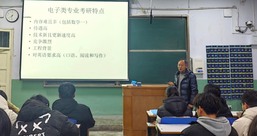 为帮助2025届员工明确职业方向,搭建一个全方位、多层次的信息桥梁,提供备考策略。3月6日,公司于教二T4举办考研指导讲座,讲座由陈新武教授主讲,2021级电子信息工程班和电子科学与技术班员工积极参加。